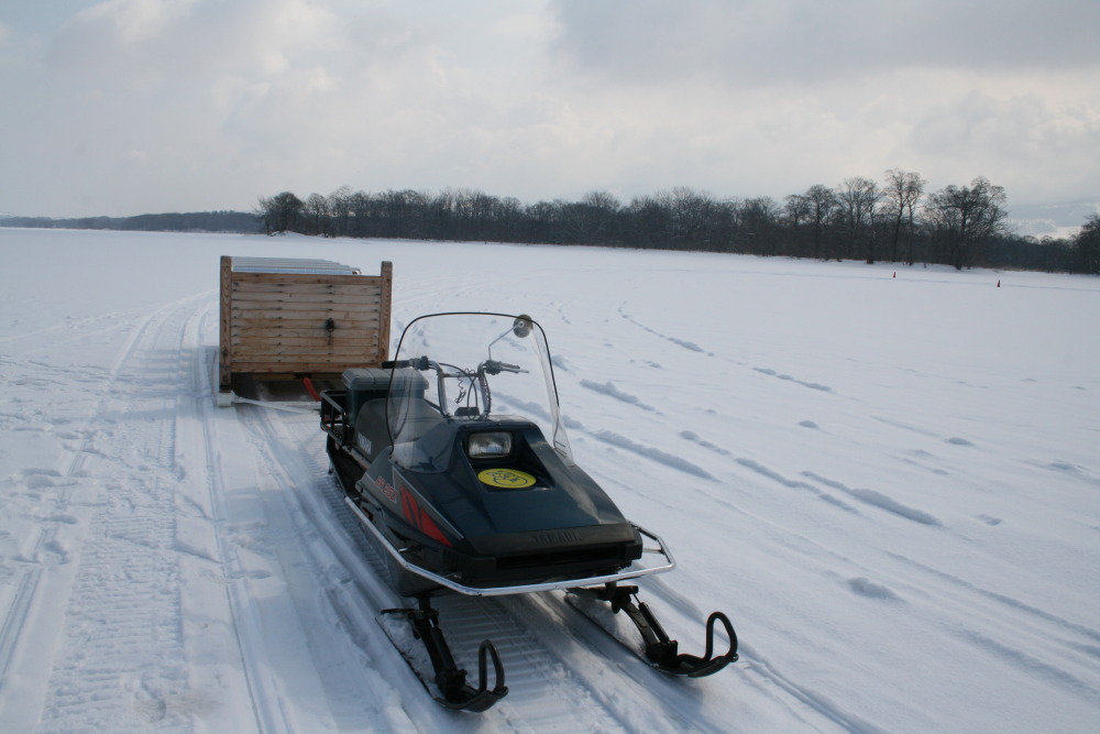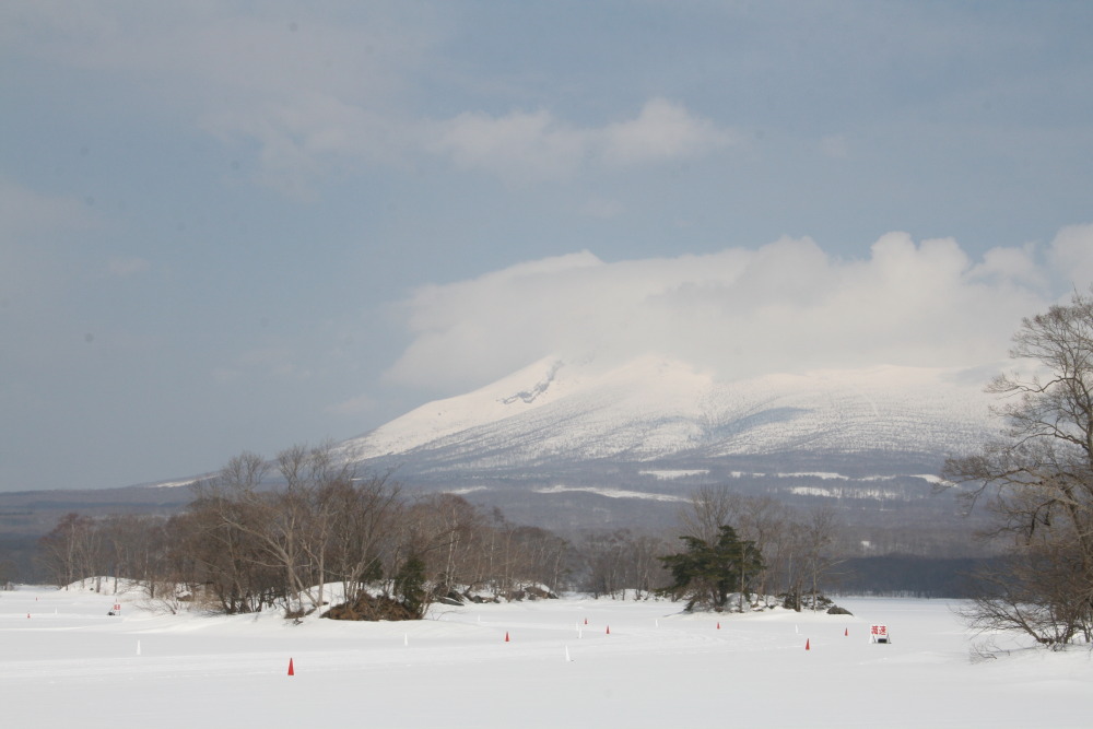 雪景色がとってもきれいです。冬ならでは、湖面をソリで走ることができ、駒ケ岳の山頂もみられることもあるようです。ソリツアーでは、氷の厚さをはかる場所に行きます。