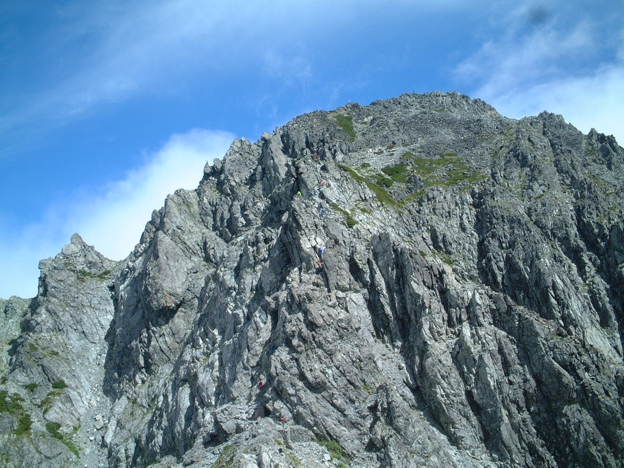 剣沢のベースキャンプで目覚めると雨が降っていた。行ける所まで行こうと思い登り始めると雨があがり晴れてきたので頂上まで行くことにした。前剣を過ぎると岩場が次々と現れるが鎖が付けられ整備されているので順調に登れる。右には源次郎尾根、左には東大谷が凄まじい断崖で切れ落ちている。まさに岩の殿堂である。頂上に着いた頃は富山方面が見えるまでになっていたのは幸運でした。