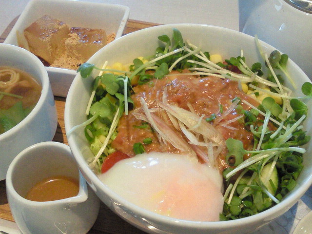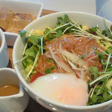 丼のセットにしてみました。お茶が数種類から選べるようになっています。丼を食べ終わった後のわらびもちが、さっぱりしておいしかったです☆