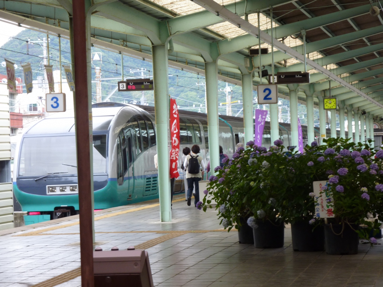 下田のアジサイ祭りに踊り子号利用。到着し乗り替えるバスの時間確認していたが4分遅れて到着。1時間に2本しかないバスがすでに出発、駅前から出発するのに何故特急が遅れて到着する情報が共有されないのだろう。観光地として是非検討してほしい。熱海からは単線のため普通と変わりないように思えましたが車内は窓も広く良かったです。