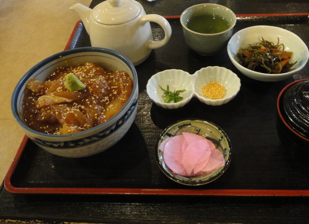 近くにある浜岡原発との関係で何となく話題になっている御前崎。沖合いは黒潮と親潮がぶつかる絶好の漁場といいますが、なぶら市場の食遊館にはそんな新鮮な太平洋のネタを売りにしたレストランが並んでました。その一つ、和風レストラン「ナチュラル」。ここはマグロといきたいところだけど、メニューの中にカツオの漬け丼という珍しい品を見かけ、さっそくオーダーしました。カツオだからどこか生臭いところがあるかなと思ったら、これがぜーんぜん。やっぱ新鮮なネタを使ってるせいかな、とも思いました。最後にダシ漬けにして食べましたが、これも美味でした。