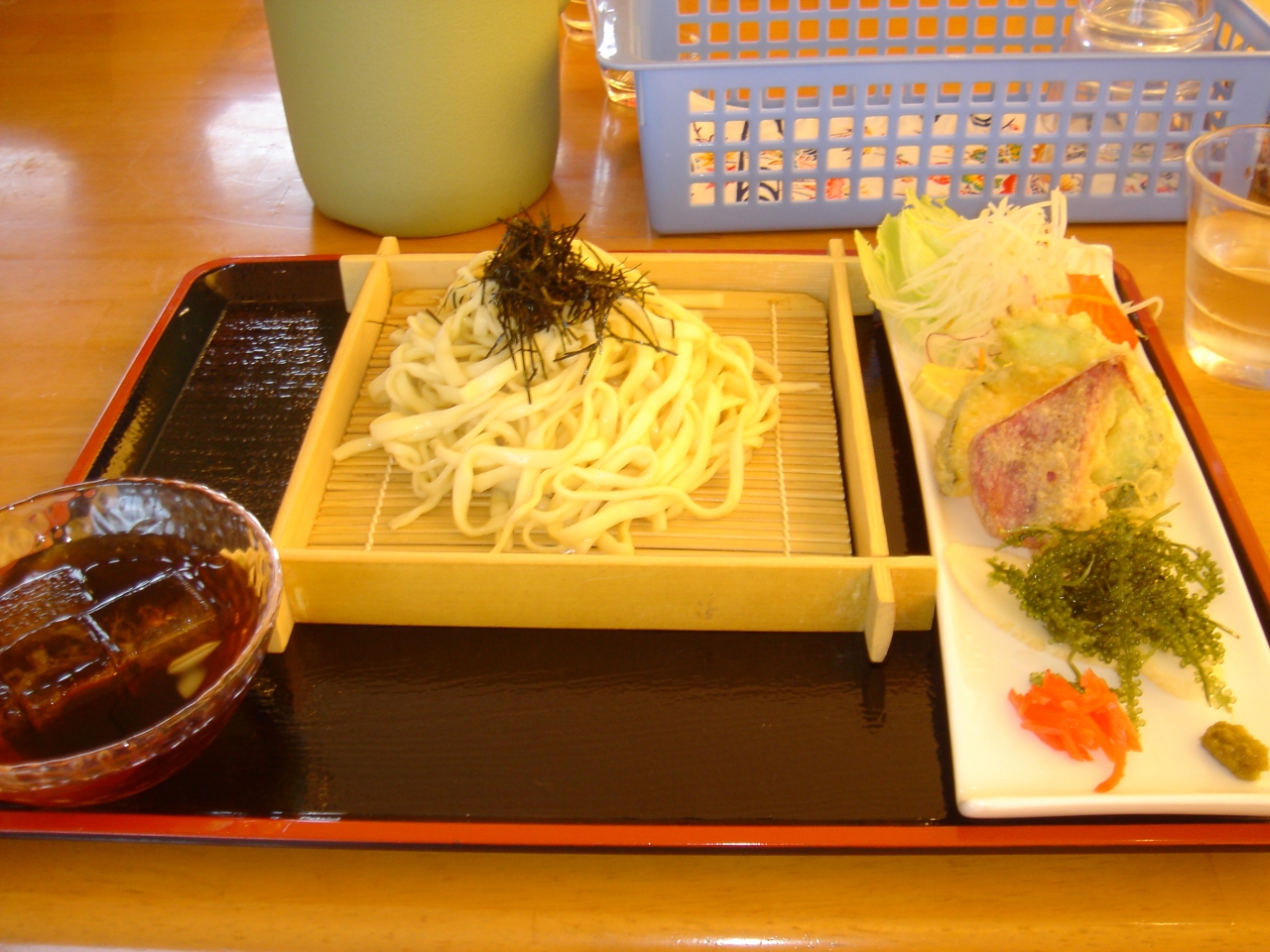 ランチタイムだったので、ランチの日替わりの生姜焼き定食があり、他の方は生姜焼き定食やパパイヤのグラタンを、私は冷やし沖縄そばを注文しました。ざるに盛った沖縄そばと海ぶどう、天ぷら(紅芋、かぼちゃ)、パパイヤの千切りが付いてます。こちらのお店は洋食も沖縄そばもとてもお味がいいと評判だけあって、細めのおそばは湯で加減が絶妙で、歯ごたえしこしこでした。生姜焼き定食もグラタンもおいしそうでした。また、オーナーの方がとてもいい方でいろいろ気遣いをしてくださいました。本部に行った時はぜひまた食べに行きたいです。次回は伊江島も見えるという海側のテラス席に座ってみたいです。
