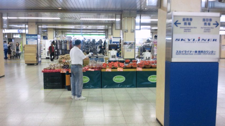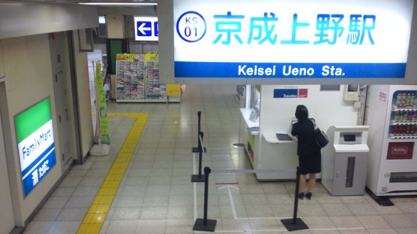 JR上野駅改札からは徒歩5分ぐらいです。駅前は道路でJR上野駅側からの入口はエスカレーターや階段で降ります。駅構内は中央に露天商、コンビニ、パンや、旅行会社、両替商等があります。成田空港への基点駅のため多くの外国人が大きなスーツケースを持った姿を見かけました。