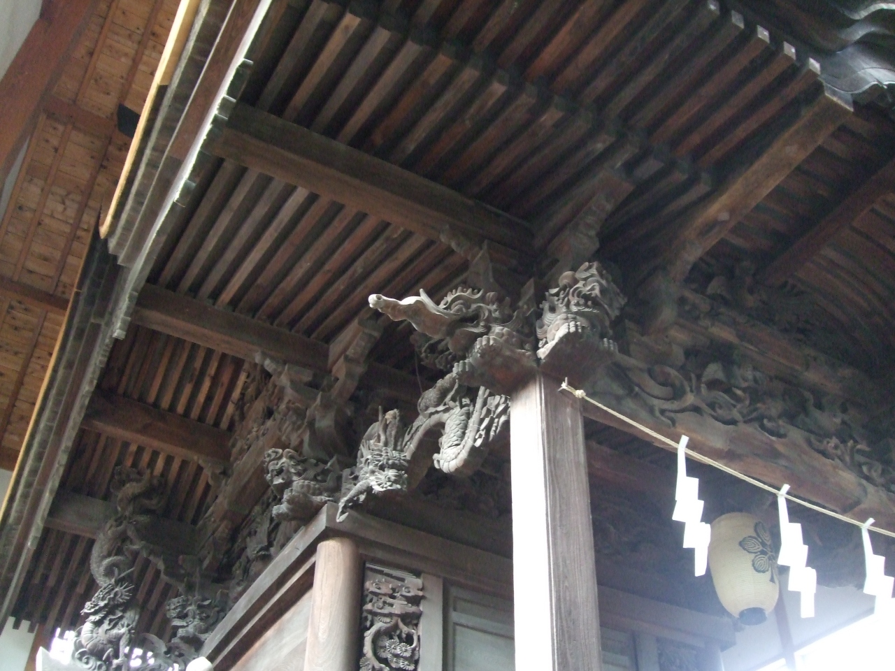 水上布奈山神社は、戸倉駅から、戸倉上山田温泉に向かう途中に立ち寄りました。神社の裏手に、なにか倉庫か車庫のような建物があるなあと思ったら、それこそが、この神社の本殿で、建物はそれを風化から守るためのものでした。入口には、立ち入りができないように、網でふさがれているので、豪華な彫り物は、その網越しに、見ることになります。傍らのボタンを押すと、彫り物の解説が流れまして。解説によると、この彫り物を彫ったのは諏訪藩の職人。テーマの多様性が素晴らしいのだとか。細かいところまでは、遠くて見えませんが、立体感のある彫刻が生き生き躍動している感じはよくわかりました。