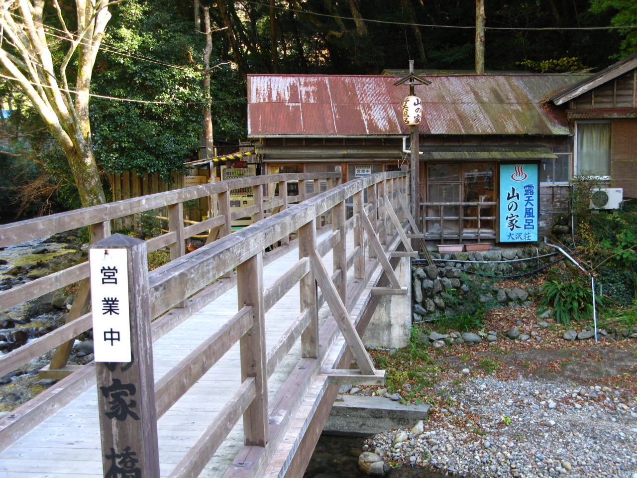 西伊豆松崎から那賀川の手前県道15号線を左折し、桜並木が続く川沿いの快適な道を暫く走り、大沢温泉の案内に沿って左折すると大沢温泉に入り、その奥に大沢荘山の家がある。