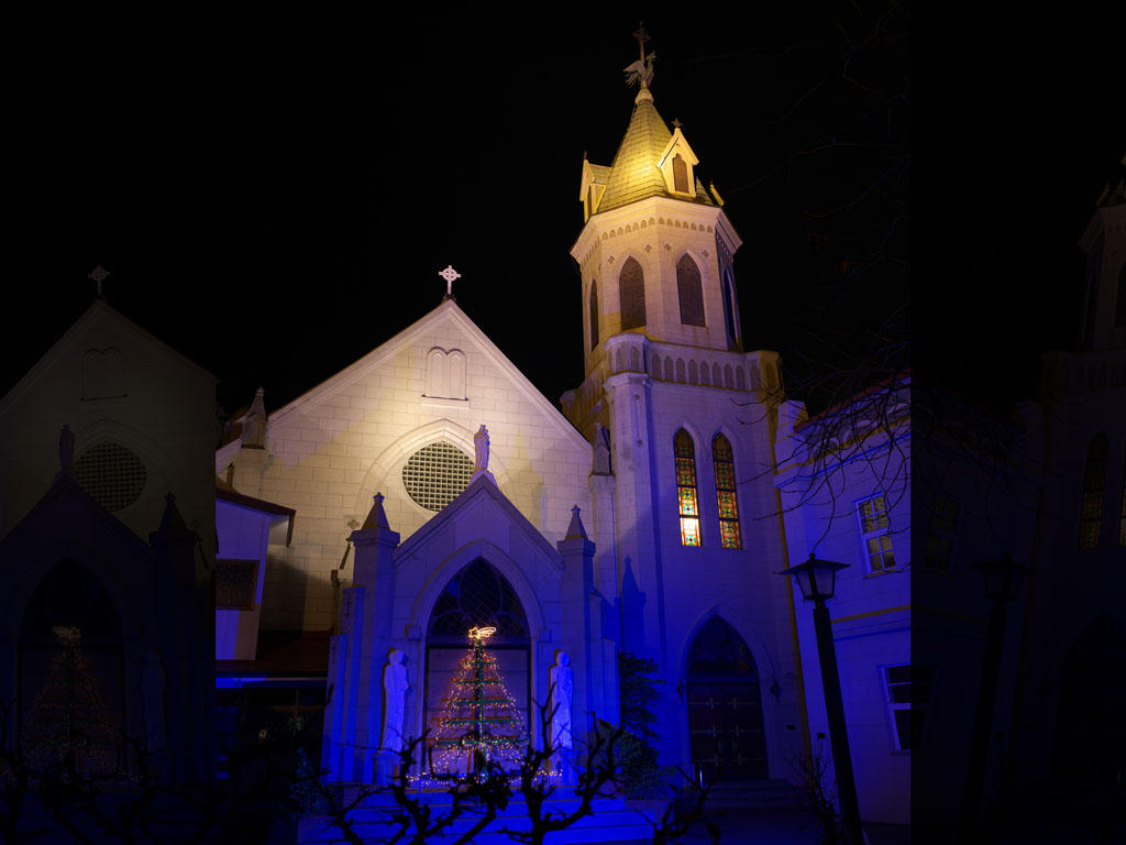 この元町に初代のカトリック教会が建設されたのは、明治8(1875)年ころの事だそうで、これは木造の聖堂だったそうです。しかし明治40(1907)年に起きた大火で、この聖堂は焼失したため、今度は煉瓦造りの聖堂を建設したが、大正10(1921)年にまたもや起きた大火で、この聖堂も外壁を残して全焼してしまいました。度重なり起きる大火に対し、今度は当時使用され始めた耐火素材である鉄筋コンクリートによる建造が行われることになりました。しかも、残された煉瓦壁を活かして。この煉瓦壁はモルタルの奥に隠れるようにして、今日も人々の信仰を支え続けています。だがこれは、歴史的建造物のレプリカ再生とは、意味合いの全く違うものなのです。