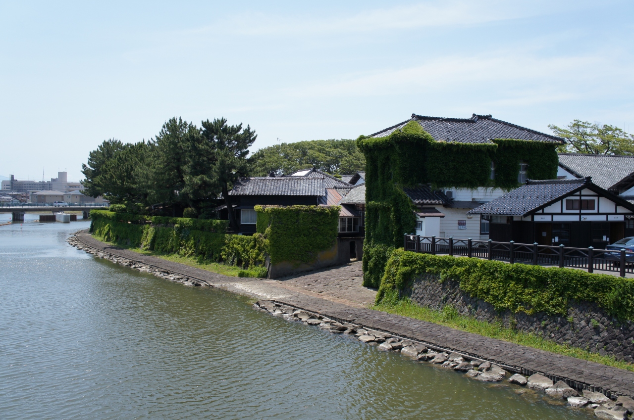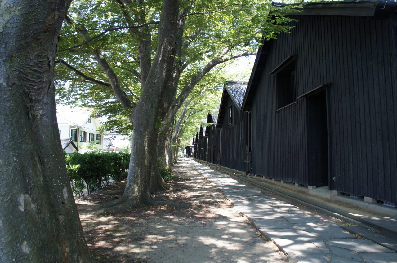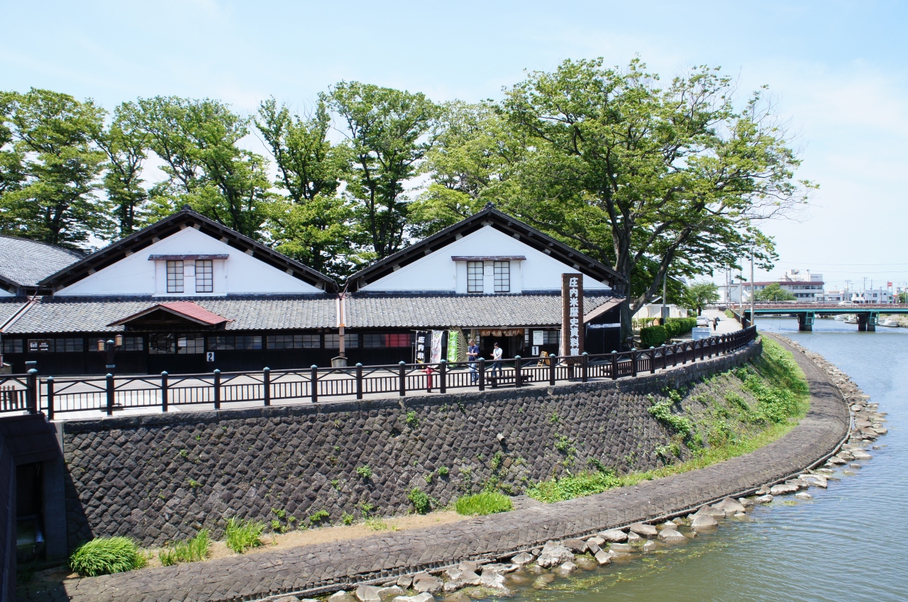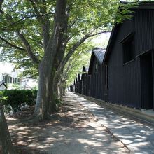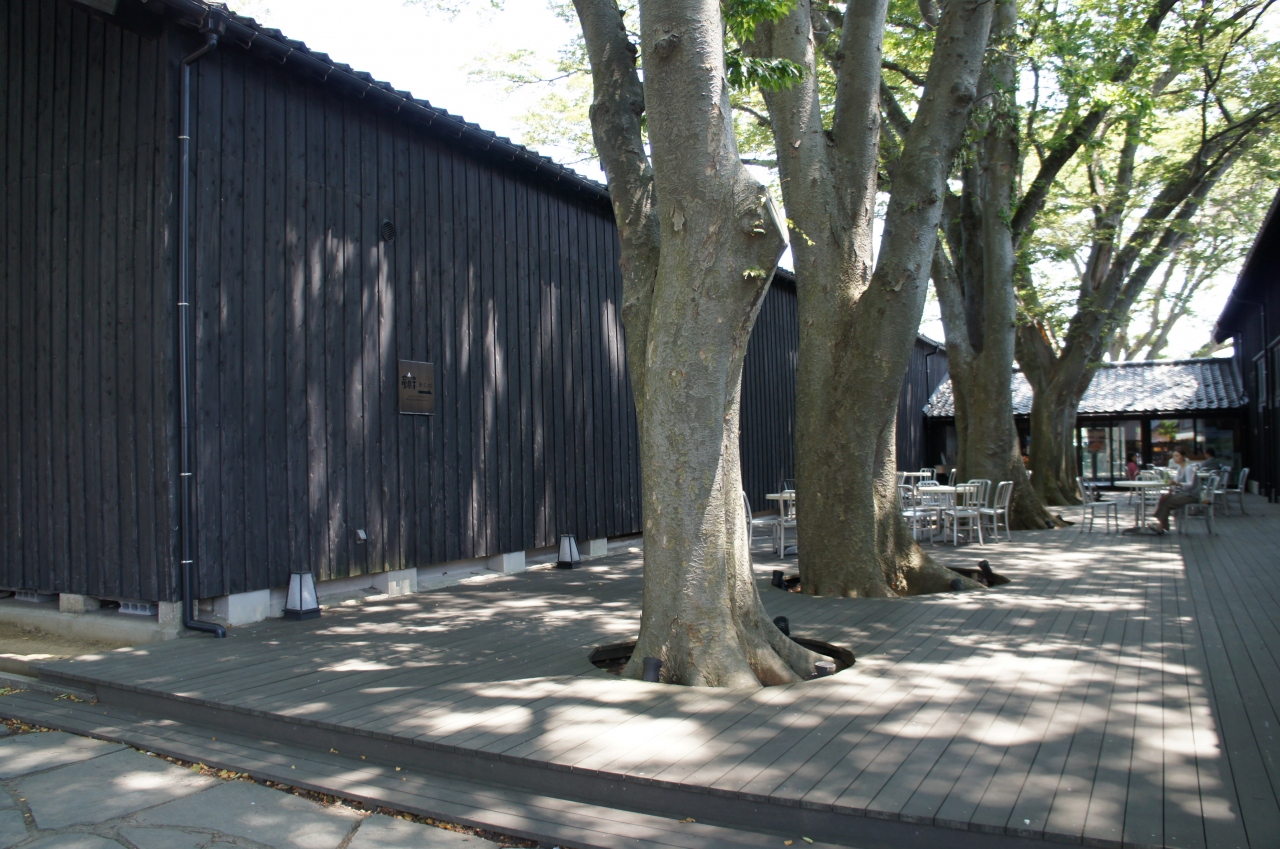 黒壁の倉庫や木陰のテラス、倉庫の反対側はうって変わって酒田の北前船で栄えた