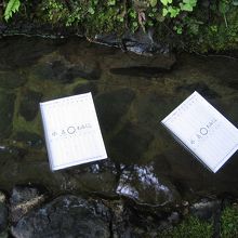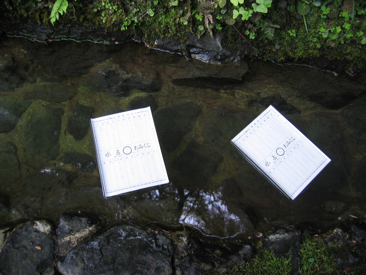 代金を渡して、水占いの用紙をもらい、神社の川の水面に浮かべます。