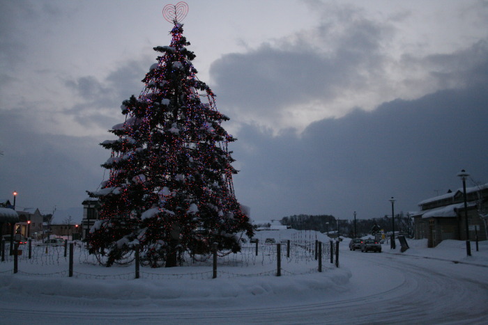 駅前には、まだ?ツリーが飾られており、夕方近くにライトがつき始めました。