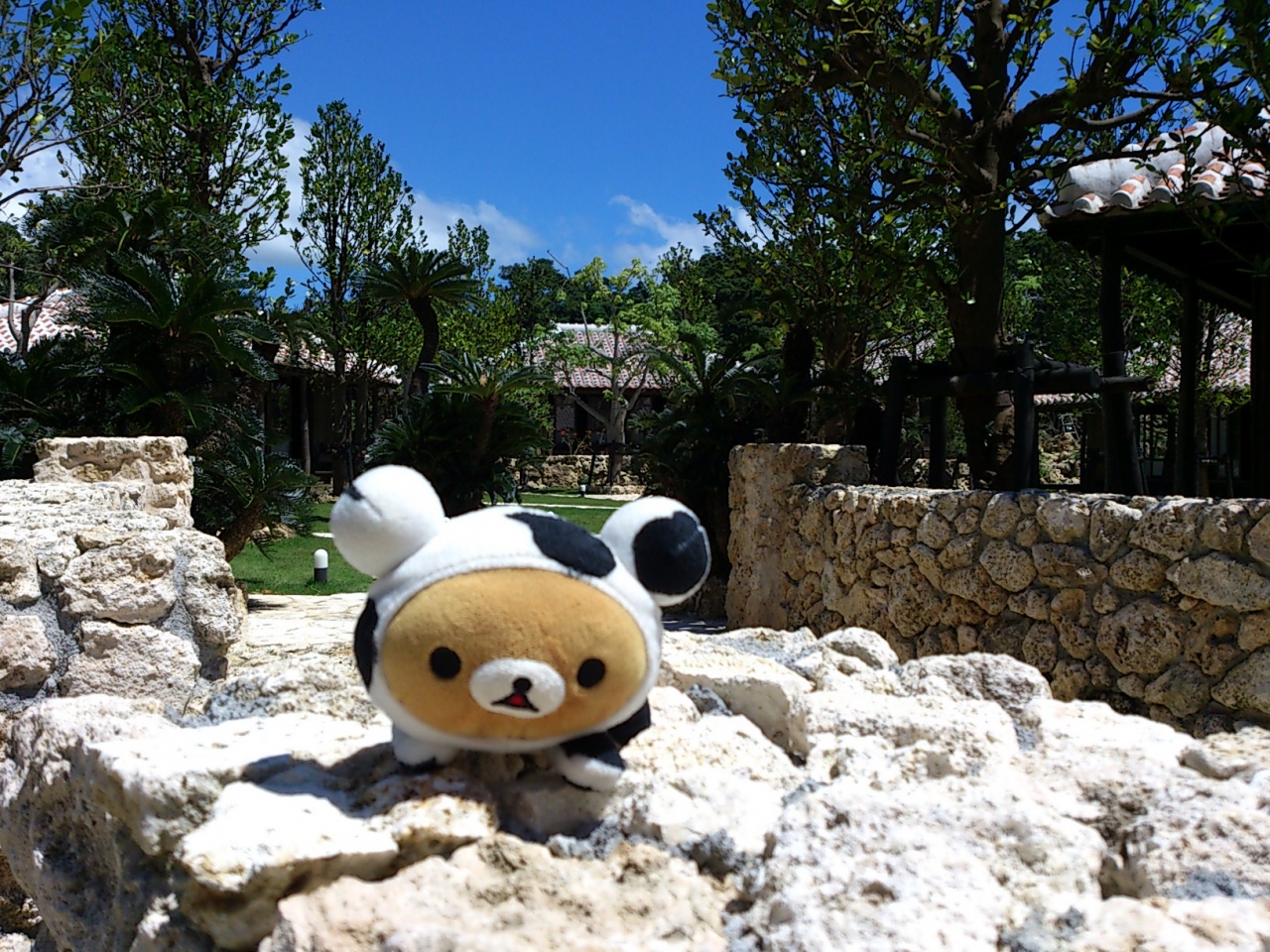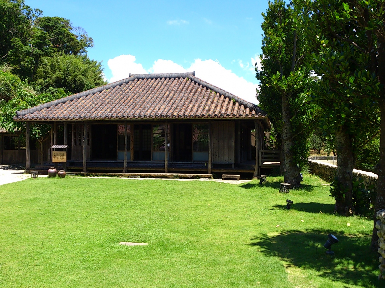 駐車場から、店内までにお土産屋などを通り、ガイドブックでよくみる大家看板が見え、芝生に建つ古民家が見えます。