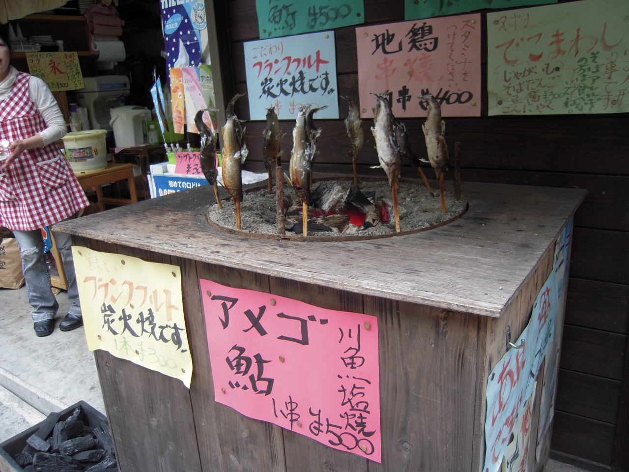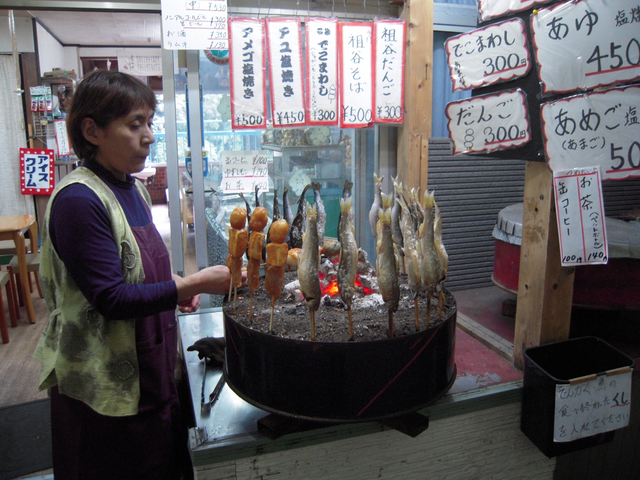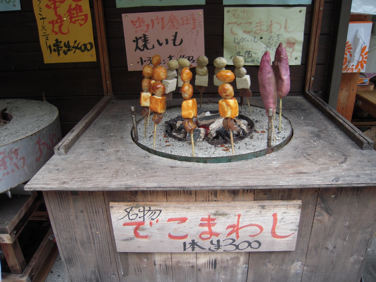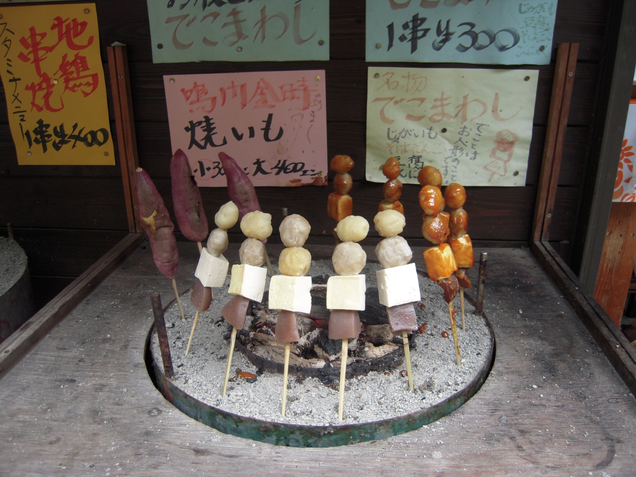 かずら橋付近にはたくさんので店があり、名物の でこまわし 団子やこんにゃくなどを味噌で焼いたもの を食べた。