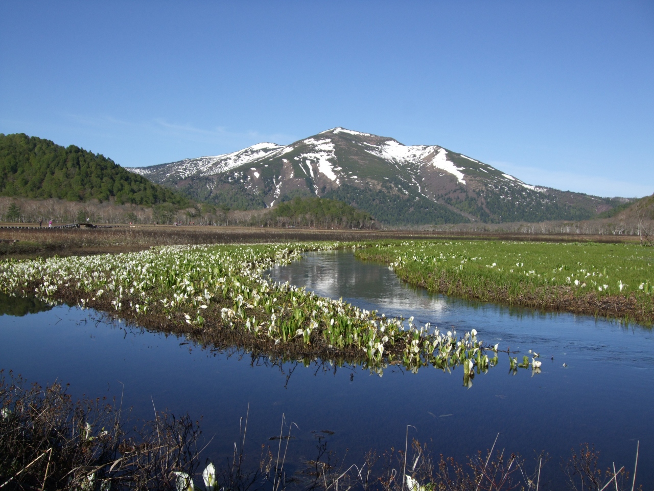 写真は、尾瀬ヶ原を代表する風景。場所は、牛首と竜宮十字路のほぼ中間地点、大堀川周辺と紹介されている一角です。観察ルートが、本道から分岐して、人気のスポットだけに人が大勢集まっているので、すぐに分かると思います。ミズバショウノ群生と至仏山の残雪の組み合わせは美しい景色ですが、この群生地の間を流れている大堀川の水の流れもまた格別。とうとうと流れる水面に至仏山が映って、これも幻想的な感じ。華を添えています。なお、写真を撮るなら午前中。午後からは、逆光になりますので。