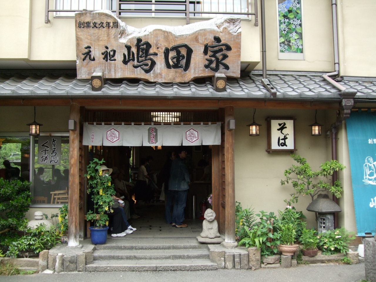 嶋田家は、深大寺そばの老舗。深大寺そばの元祖の看板で、深大寺の山門を出て、すぐの場所にあります。創業は文久年間。現在は5代目だそうです。さて、私は、この季節。冷たい「梅おろし」をいただきました。冷たいおろしそばは、汁に付けていただくのが一般的だと思いますが、ここのは、暖かいそばと同じで、ひたひたの汁。しかし、その汁が妙に奥行きがあって、麺と合わせて絶品の味でした。カツオだしだとのことで、昆布は使っていないのだとか。それだけ聞いてもまねの出来るわけはないのですが、何か納得。生の持ち帰りそばもありまして、これなら自宅でも楽しめそうです。