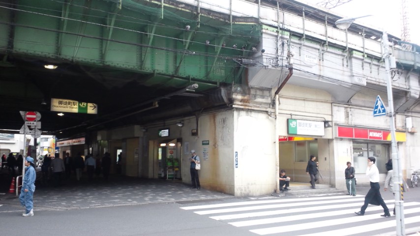 上野駅からもアメ横をぶらぶら歩いても15~20分ぐあいで着きます。ホームは高架にあり駅前は道路でアメ横もすぐそばにあるので、人が多く、ごちゃごちゃしています。駅周辺は多くの店が連なっていて下町の雰囲気は味合えます。