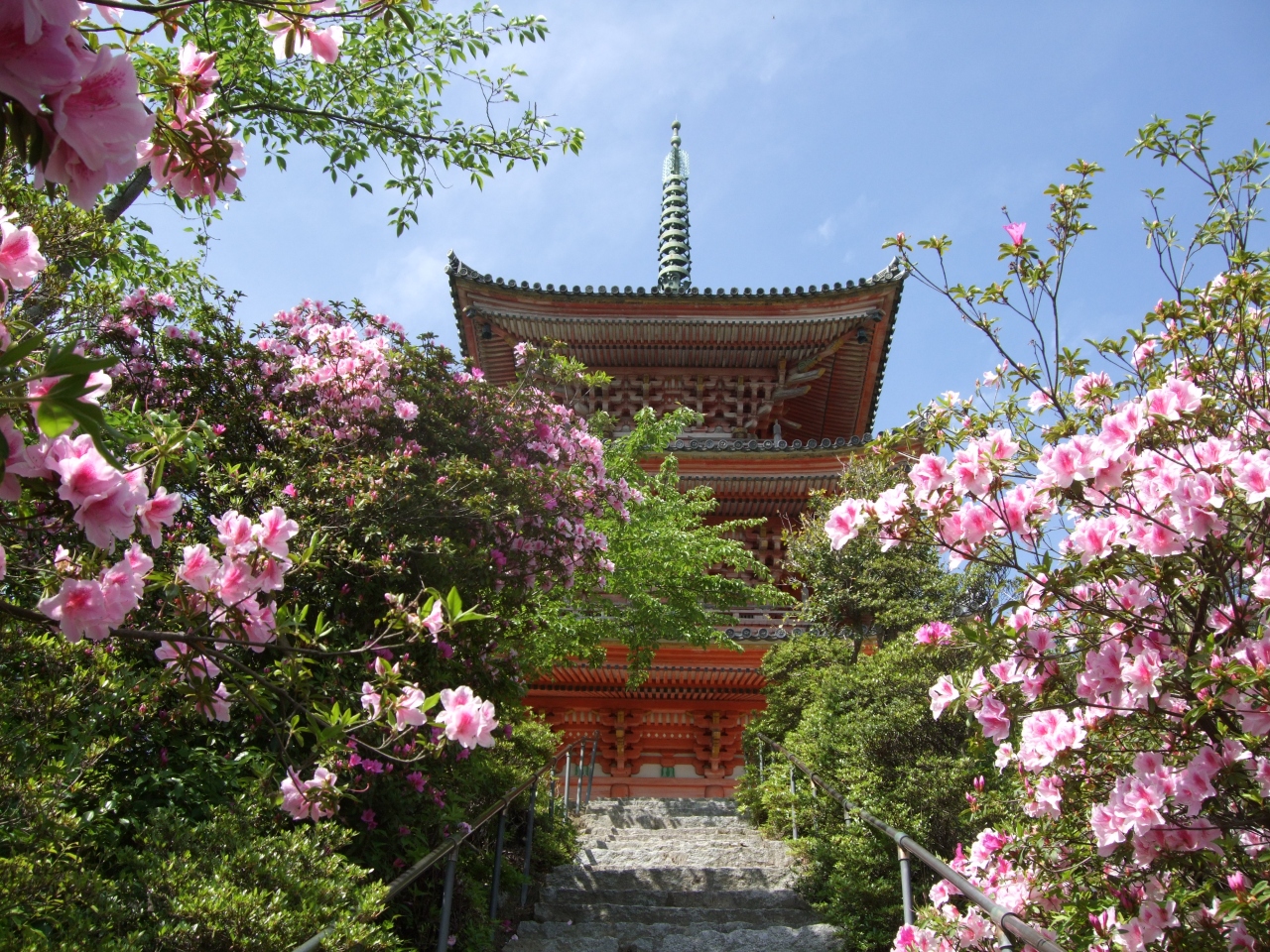 向上寺は、平山郁夫の出身地、生口島の山頂に建つ寺。創建は1400年、聖観世音菩薩を本尊としています。ただ、まず目に入るのは、国宝三重塔。これは、島の中からだとどこからでもよく見える場所に建っていますので、それだけでもう見たつもりになってしまうのですが、それでもと思い、近くまで登ってみました。すると、写真のように、石段の両脇に咲く満開のツツジと赤い朱塗りの塔のコントラストで、すばらしい美しさ。また、この塔の後ろに回ると展望台も。展望台からは、塔を眺めおろして、その向こうに瀬戸内海が見えるという贅沢な景色も拝めます。港からでも、歩いて10分ほどです。