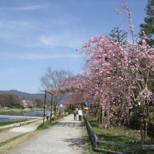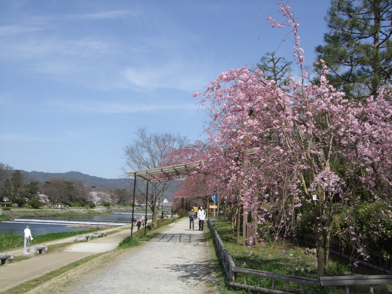 半木の道は、「なからぎのみち」と読みます。北山通りから賀茂川を上流に向かって行く、府立植物園沿いの堤防に続く小道です。歩くと全行程は20分くらい。ただ、出町柳から歩いても30分くらいで行けますので、時間がある方はこれがお勧め。堤防沿いにまずはソメイヨシノの桜が点々と続く小道を行きます。賀茂川は、所々、川がせき止められて小さなダムがありますので、これも楽しいですね。で、この半木の道以降になると、今度はピンクの濃い紅しだれの桜並木。何か高級感のある美しさに変わります。最近は、周囲の土を人が踏み固めるので、木が弱っているのだとか。大切にしたいものです。なお、ここは開花の時期は少し遅めです。