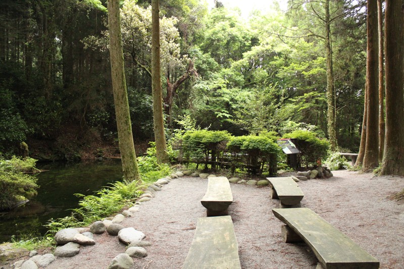 広い池の中から水がこんこんと沸き、あたりの森は夏でも清涼感がただよいます。