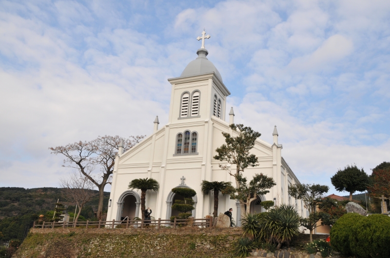 田園地帯の小高い丘の上に立つ教会です。装飾は素朴ですが、ステンドグラスは大変貴重なものなのだそうです。アクセスは本渡バスターミナルから河浦高校までバスに乗り、ここから老人ホーム春光園行きバスに乗り、天主堂入口下車です。本数が少ないので事前に確認してください。時間が無い方は本渡から定期観光バスに乗るのも手です。