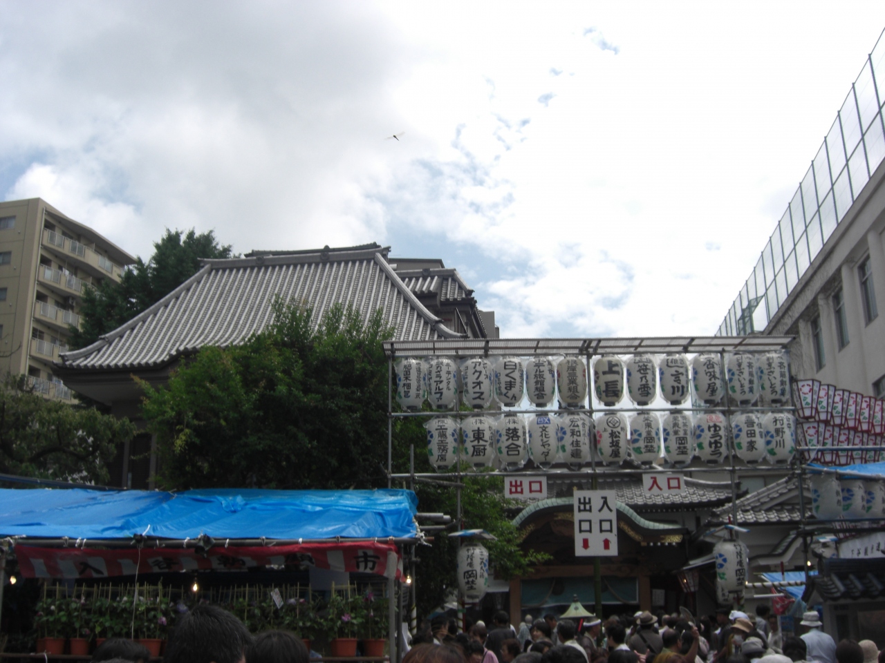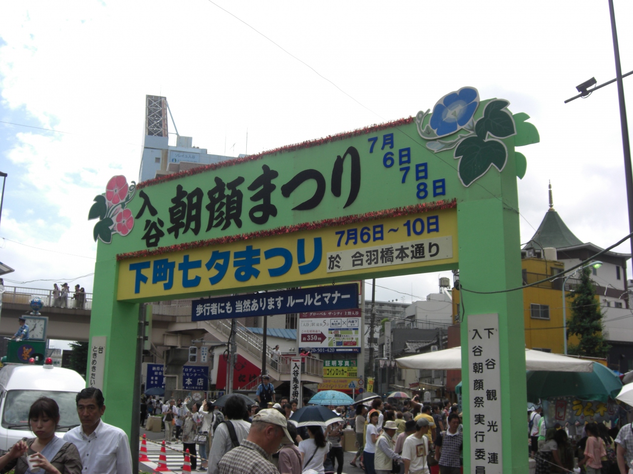 7/6−8まで朝顔市を実施中。価格はほんとうに2000円からの横並び。鬼子母神側に朝顔、反対側に飲食関係が出店をしています。鬼子母神でも御利益のありそうな、朝顔のお守り400.800円で販売中でした。入谷下車すぐ