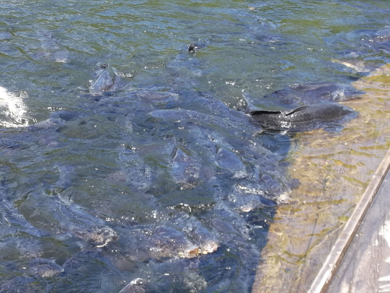 ボート乗り場に行くと、大きな鯉が餌を目当てに集まります。