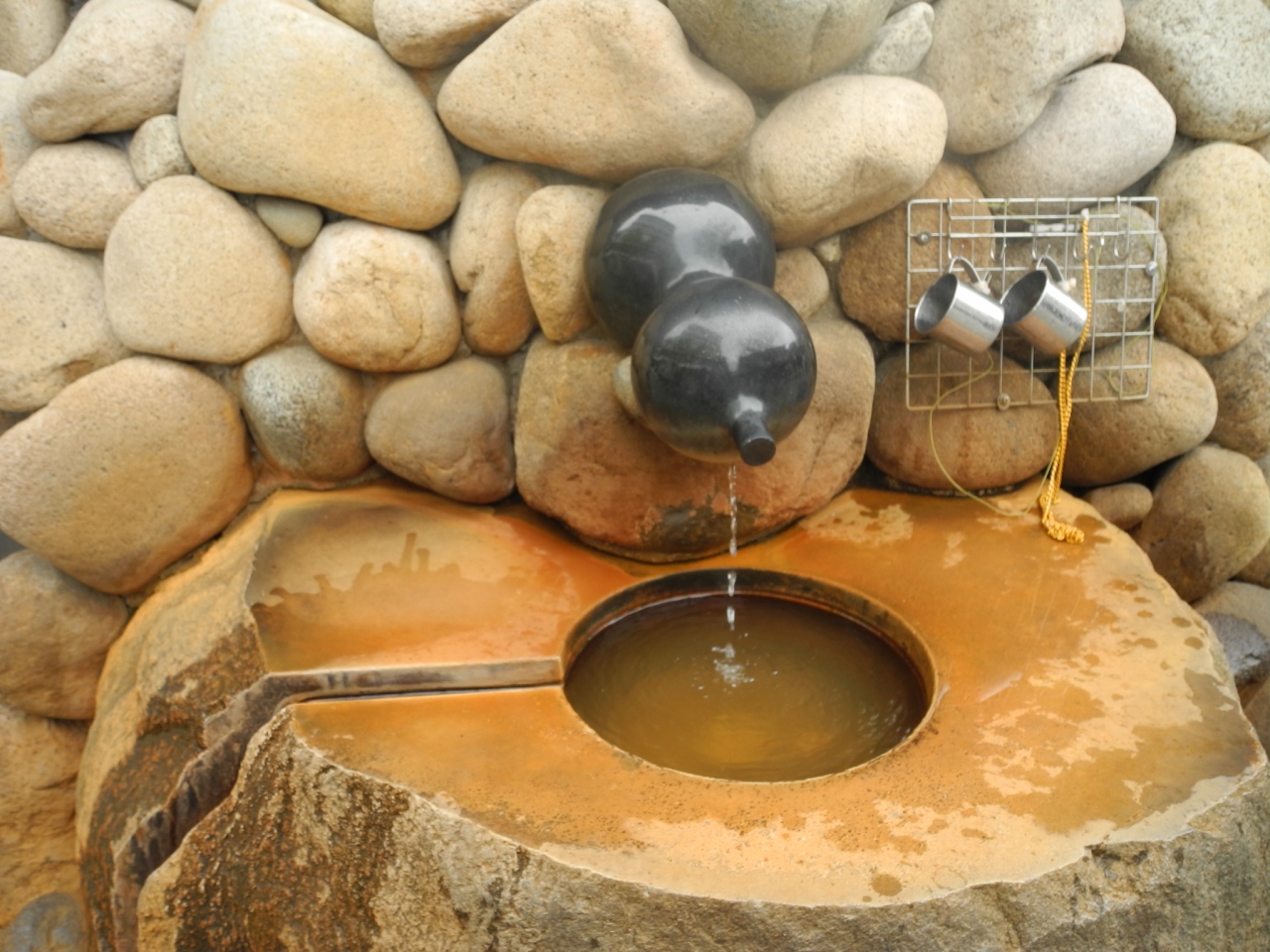 金の湯の建物外にこのひょうたんから温泉が出ています。ここで、手に触ってみて、温泉の暖かさや触った感覚が最高です。温泉に入る前または、入れなくても温泉に来た感じだけでも味わってもらえればと思います。ぜひ、