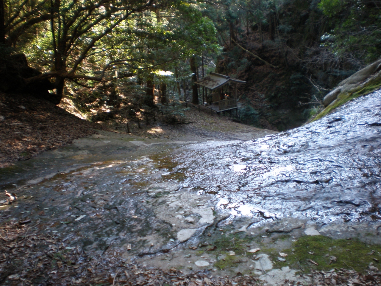 室生寺から少し足を延ばして山道を歩き、辿り着いたところは神秘的な雰囲気の渓谷であった。岩の山肌に水が流れ落ちその先に龍が住みそうなほら穴がある。すべり落ちそうな傾斜で穴を覗くことは出来ない。路の端に小さいお社があり恋人らしいカップルがお祈りしていた。パワーをもらって帰途についた。