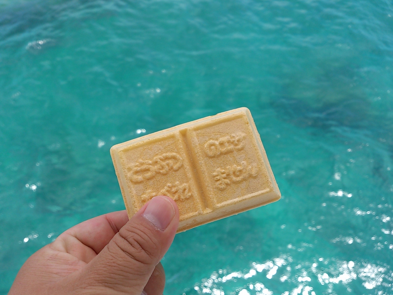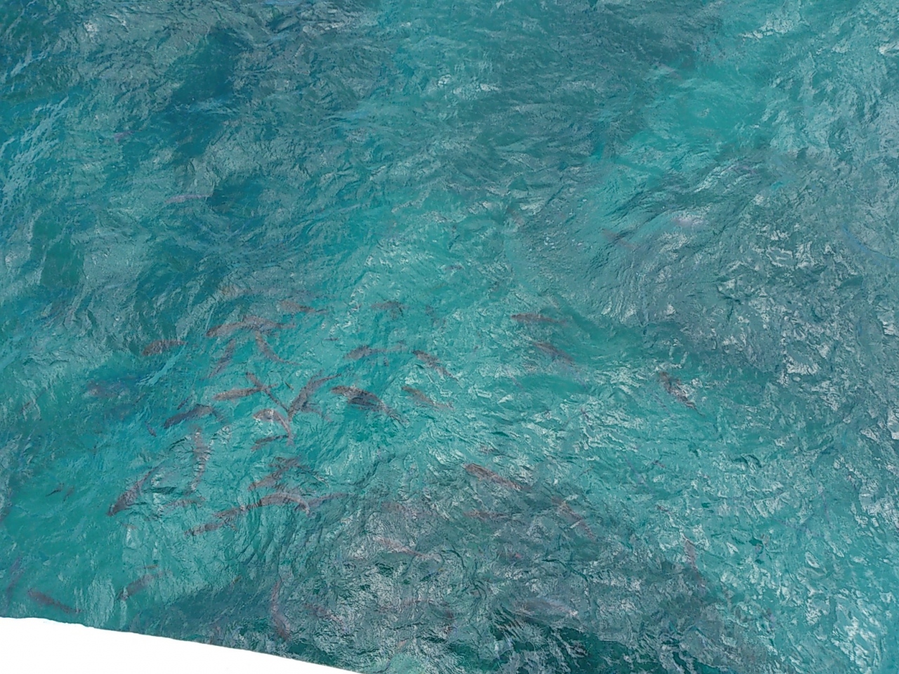 エサを1つ1つ海中に投げ入れると、大量の魚が寄ってきます!