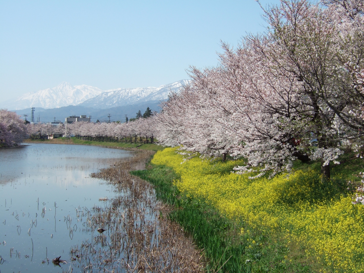 公園に到着し、山・菜の花・桜と川、お城・噴水・桜のコラボレーションが素敵でした。