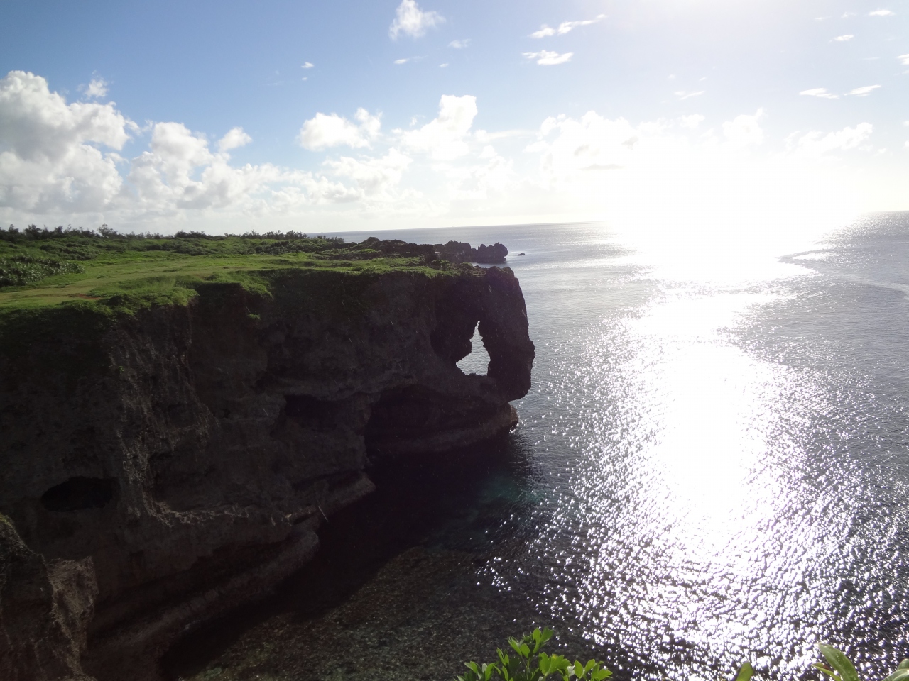 国道から1本入って走ること数分で到着です。無料駐車場から遊歩道が整備されており、その遊歩道を歩いていくと、すぐに万座毛が見えてきます。海に突き出している万座毛は、海水で侵食されているのか、ところどころ空洞になっていて、なかなかの見応えです。また太陽の照り返しを受けた海の海面がきらきらと輝いていて、とてもきれいでした。遊歩道は5分くらいでぐるりと一周出来るので、あまり時間がなくても、さくっと立ち寄れると思います。