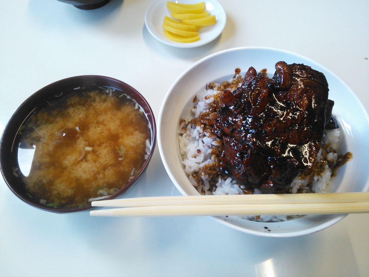 黒っぽいタレの豚丼で、お肉は柔らかいしタレにうまみがあります。