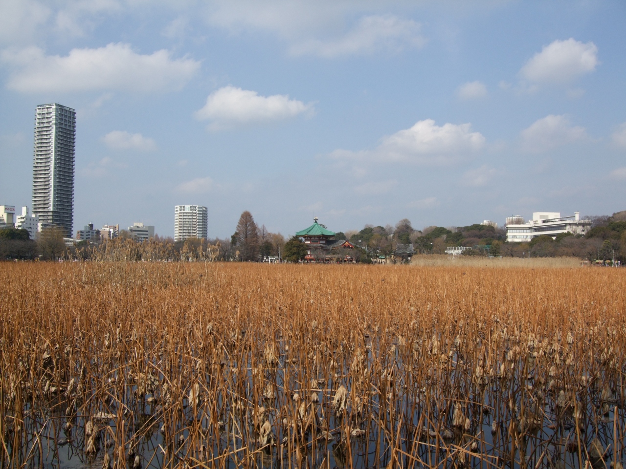 上野駅から見える上野の山の向こう側に広がる不忍池です。この一帯は、ハスの花が群生していまして、夏には青々としたハスの葉っぱの間に、大輪のピンクのハスの花が咲くのですが。今は冬なので、こんな風に、枯れ枯れの状態。しかし、枯れているので、湖面が少し顔を出して、そこに映った青空がきれいです。また、別に海の近くというわけではないのですが、かもめがたくさんいまして、観光客を楽しませています。周囲は、約1キロといったところ。この蓮池のほかに、ボートが楽しめるエリアもあります。