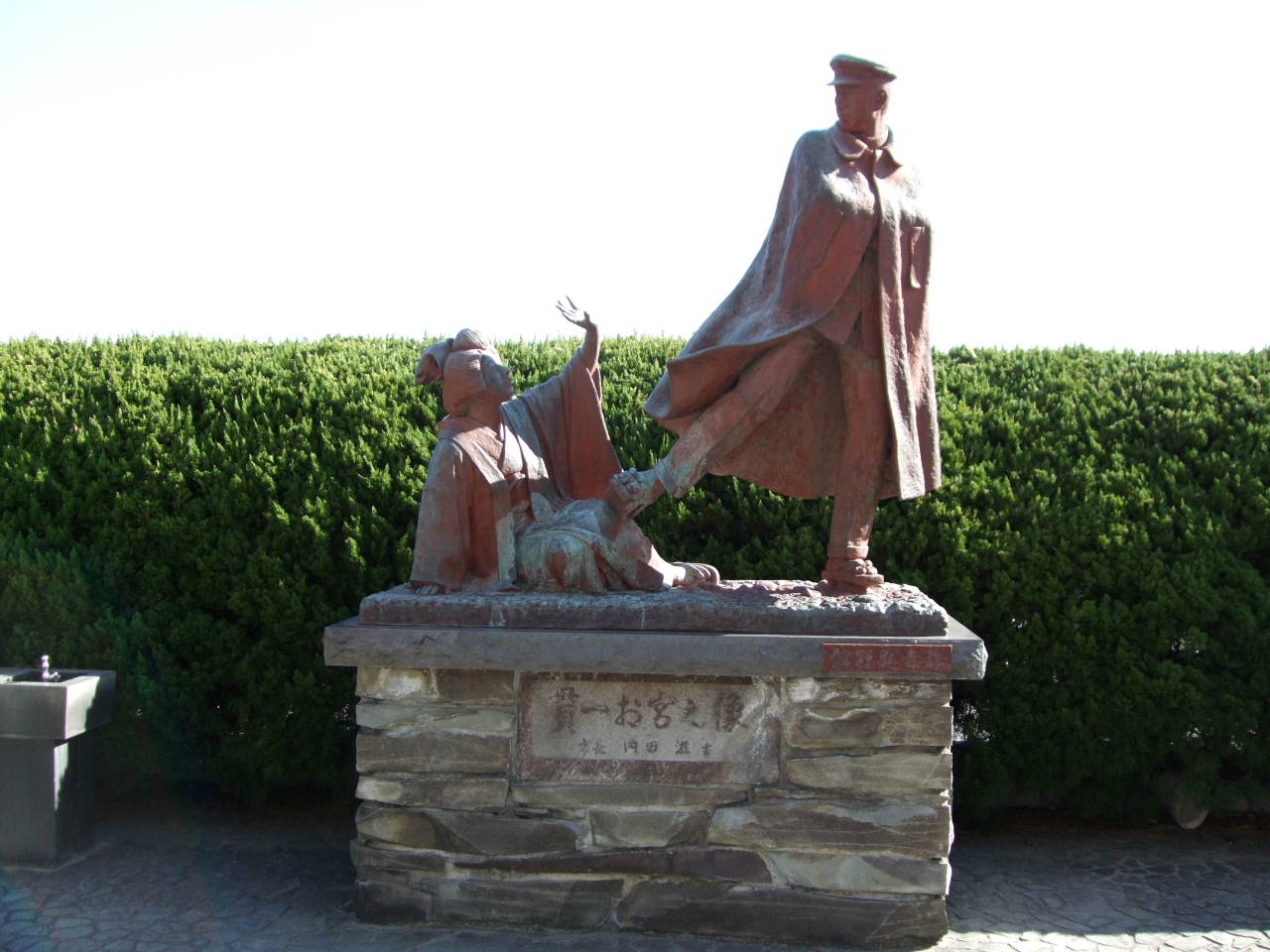 お宮の松は、熱海市のサンビーチ付近、海岸端を走る国道135号線沿いにちょっとした広場があり、そこにある割とこじんまりした松の木です。しかし、これは尾崎紅葉の新聞小説「金色夜叉」で、間寛一とお宮の別れの場面の舞台になったといわれている場所ですので、熱海を代表するスポットと言えるでしょう。広場には、松の木の傍らに、お宮を蹴る寛一の像があって、小説の内容も詳しく説明しています。古臭い話と思っていたのですが、当時の庶民の熱狂振りもよく分かりました。古くは、北条政子が、親の勧めた縁談を拒否して伊豆山神社に逃げ込んだという場所なのですが、小説は逆のパターン。男女の仲は一筋縄では行きません。