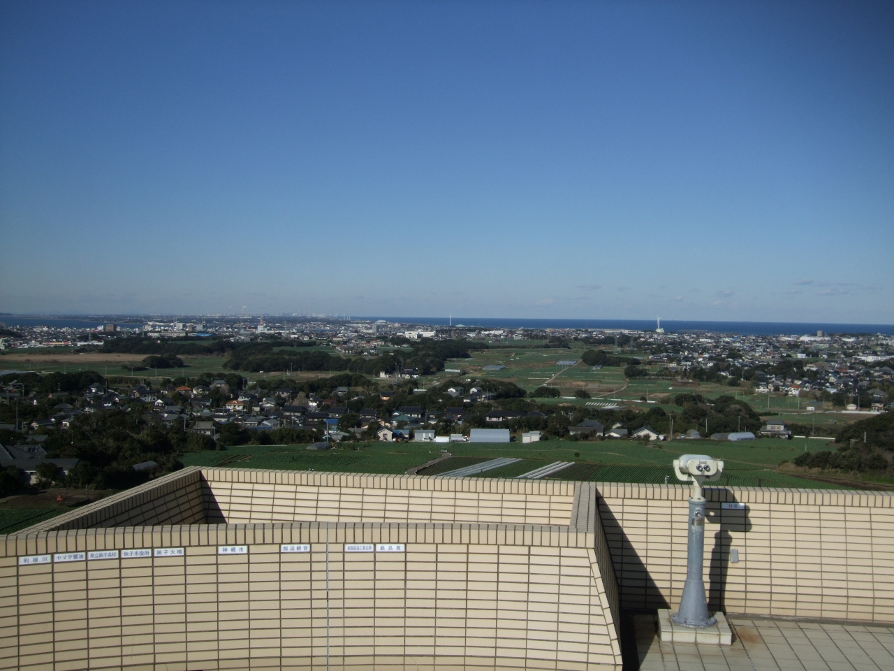 地球の丸く見える丘展望館は、銚子駅から出ている犬吠方面行シャトルバスの終点にあります。時間は、30分足らずでしょうか。割と近いです。終点のバス停から少し登ると展望館はすぐ。屋上が展望台になっていて、360度のパノラマが楽しめます。特に、犬吠埼灯台は、絶景。海に突き出た灯台が見えるのは、ここだけです。ただ、遠くて小さくしか見えませんので、デジカメでは無理。なお、ここと銚子ポートタワーの共通券があり、500円でした。前庭に、フィリピンとの友好の碑がありました。この形もへらのようで、変わっています。