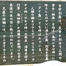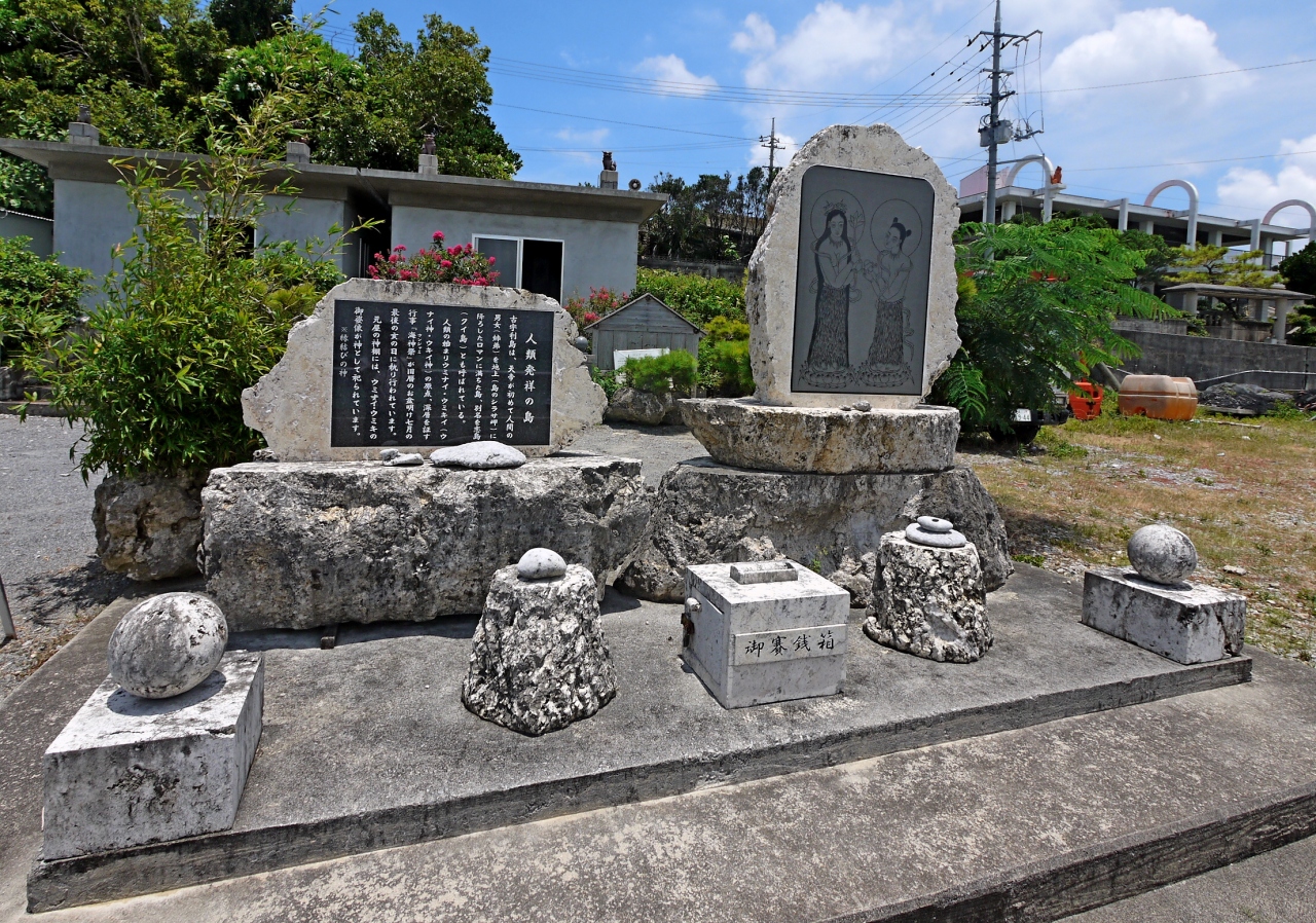 古宇利島で,もしカップルが行くとすれば,ハートロックのある海岸とアダムとイブ伝説があるウフマドウィにいくといい.ハートロックはまさしくハート形の岩.島の橋の反対側にある.ウフマドウィは橋からすぐ,港の端のほうだ.昔、古宇利島に空から男女二人の子供が降ってきた。彼らは全くの裸であり毎日天から落ちる餅を食べて幸福に暮らしていた。最初はそれに疑問を抱かなかったがある日餅が降らなくなったらどうしようという疑念を起こし、毎日少しずつ食べ残すようになった。ところが二人が貯えを始めたときから餅は降らなくなった。二人は天の月に向かい声を嗄らして歌ったが餅が二度と降ってくることはなかった。二人は生活と労働の苦しみを知り、ジュゴンの交尾を見て男女の違いを意識し恥部を蒲の葉で隠すようになった。この二人の子孫が増え琉球人の祖となった、と云う神話である。Wikipedia
