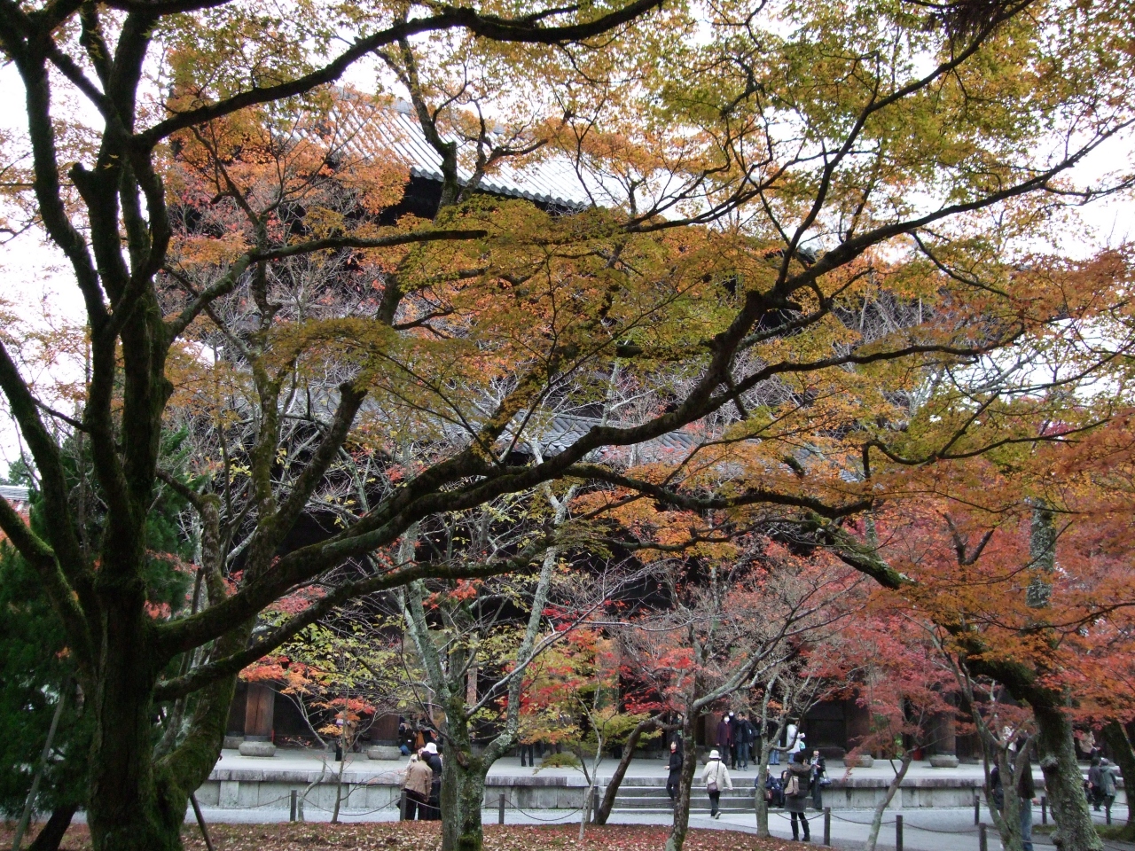 南禅寺は鎌倉時代に亀山上皇の離宮を禅林禅寺としたのが始まり。禅宗の寺の格付けで、五山の上(一位は嵐山の天竜寺)。最高の位を与えられました。この山門は、藤堂高虎が大坂夏の陣で戦死した一門の武士たちの冥福を祈るため寄進したもの。上層には、釈迦如来と十六羅漢像が安置されています。ほか、石川五右衛門が「絶景かな絶景かな」の名台詞を吐く歌舞伎「南禅寺山門」もここが舞台となっています。ただ、この時期は、当然に、お目当ては紅葉。山門の柱越しに見える紅葉が定番のアングルなのですが、紅葉に透けて見える山門もなかなかでしょう。