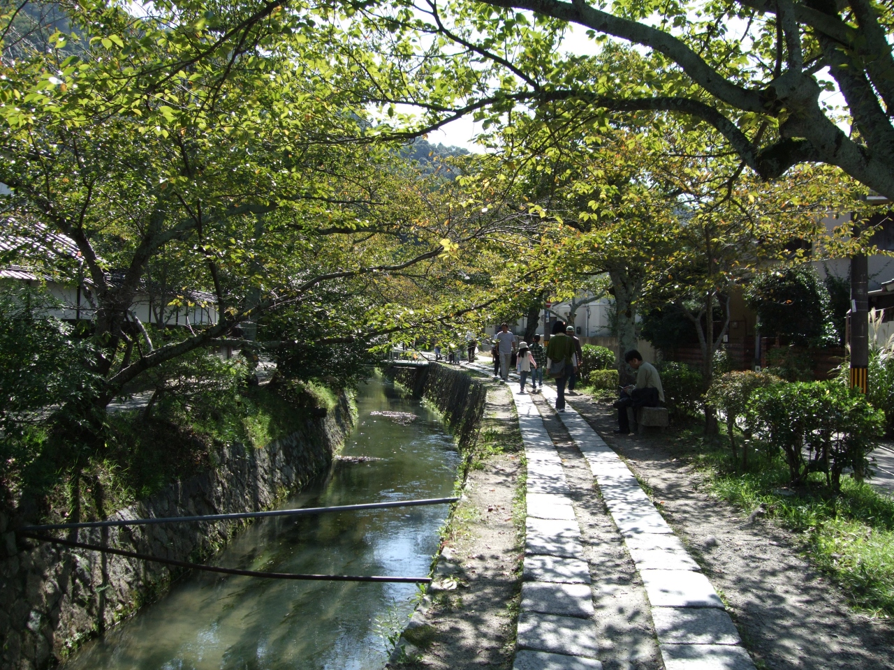 哲学の道は、銀閣寺から南禅寺付近まで。日本を代表する哲学者であり、京都大学の名誉教授でもあった哲学者・西田幾多郎がこの道を散策しながら思索にふけったことからこの名がついたと言われます。琵琶湖疏水に沿って歩くと、いつもながら、修学旅行の学生がいっぱいです。