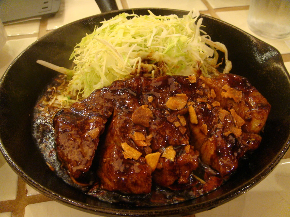テキの上にはスライスニンニク、ソースがたっぷりかかっています。