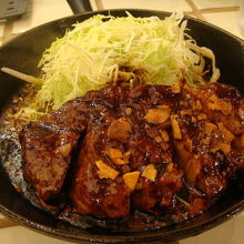 ジュージューと焼かれた鉄板に分厚いトンテキとキャベツ、スープとご飯が出てきます。