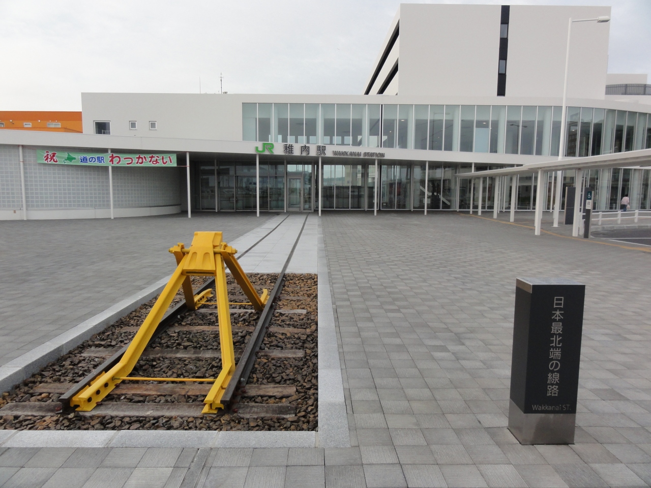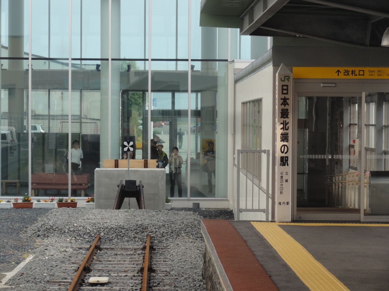 日本さいはての北の終着駅は簡素で素朴な寂しいイメージでしたが、バリアフリーの白く明るいモダンな建物でした。4月に立て替えられたとのことで、昔の駅舎より少し南に移動したらしく、昔の線路がそのまま駅舎を貫いて外にモニュメントとして残されていました。