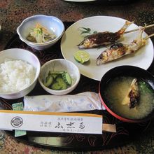 その料理の内容は、鮎の塩焼き&味噌タレ、稚鮎の酢の物、鮎入り味噌汁、ご飯、漬物でした。