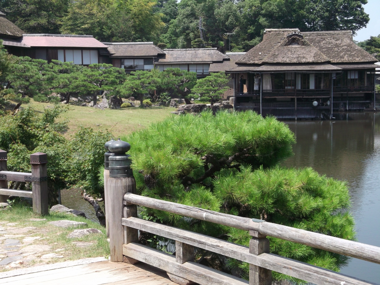 江戸時代初期に7年かけて造営された大名庭園で、池に建つ臨池閣や鳳翔台といった