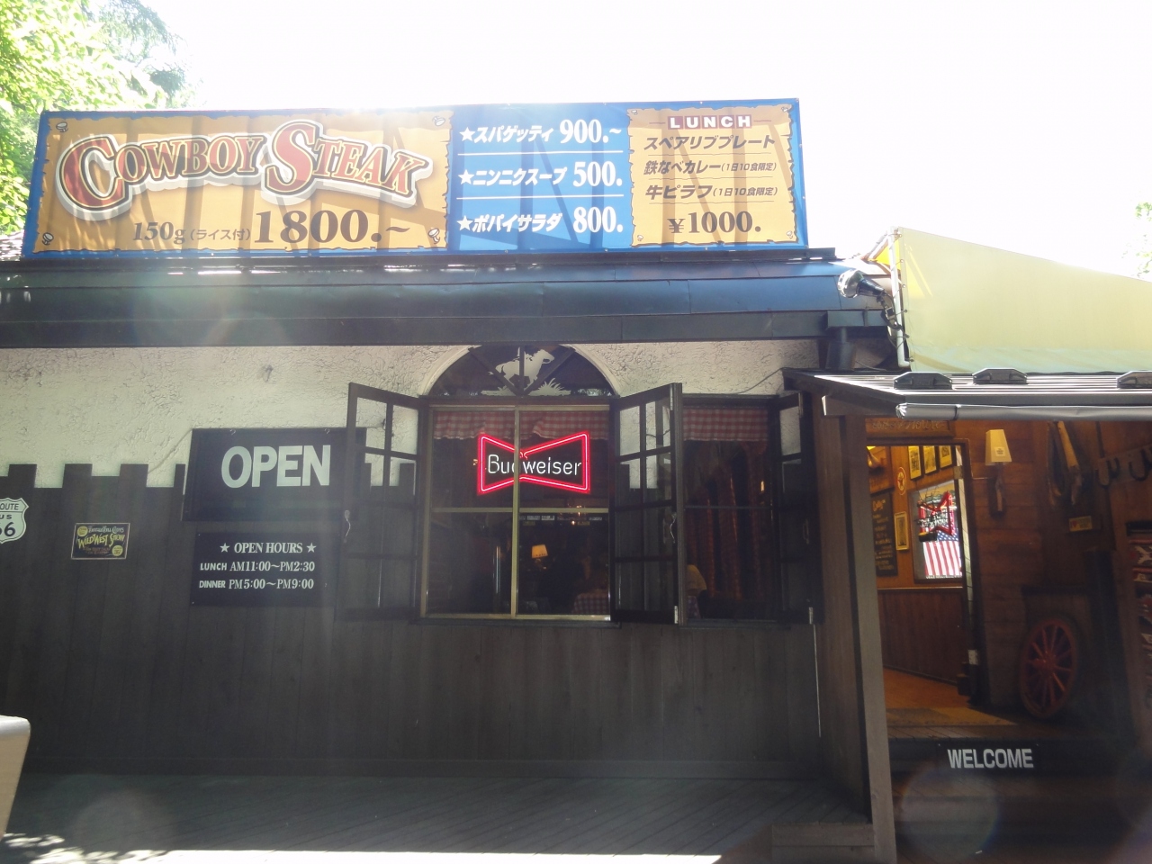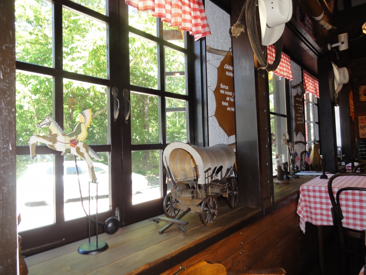 お店の名前の通り、店外には乗馬用の鞍、店内には幌馬車や牛の置物が飾られてます。お店の方もカウボーイハットを被ったウェスタンスタイルです。ステーキが美味しいと聞き