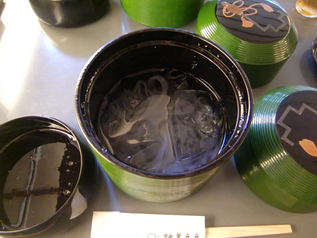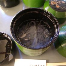 おひつのような器に黒蜜のソースと氷で冷やされたくずきりが入っており