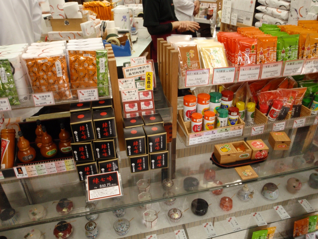 清水坂と五条坂が交わる北西の角に七味屋本舗があります。清水坂は言わずと知れた清水寺の門前町で数多くのお土産物屋や八ッ橋専門店が軒を連ねています。特に八ッ橋店の競争は激しく、どのお店も多くの試食品で観光客の気を引こうとしています。それぞれの店舗で数種類ある味の八ッ橋を試食すると、お茶もサービスでありますが、かなり甘ったるくなります。そこでこのお店に入ったら、上品で薄味のだし汁に、このお店の一味や七味をふりかけ試飲させてもらい、ホッと一安心できる味のなかにピリっとすっきりした感じもありとてもおいしかったです。甘いものは苦手というほどではないですがもともと甘党というほどでもないので私はこちらのほうが良かったです。思わず一味と七味を買って帰りました。(八ッ橋の試食を控えればいいのですが、いろいろな味があると思わず食べてみたくなる)