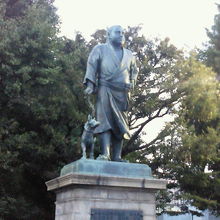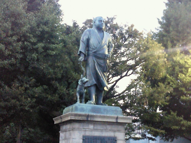 場所はやや分かりにくく、上野公園の入口の階段を登り、駅方向にちょっと入ったところに立っています。現在銅像付近はじゅらくの建て替え工事に伴う柵が設置されていることがあり、ちょっと目障りです。