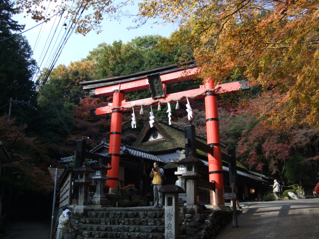 嵯峨鳥居本は、古くは「化野(あだしの)」と呼ばれ、京の人々の埋葬の地でした。現在の町並みは愛宕神社の門前町として発展したもの。愛宕神社はこの鳥居のさらに奥にあります。鳥居本の名前は、大文字焼の鳥居の形の火がこの辺りで焚かれるので、その鳥居のもとという意味だとか。下手の化野念仏寺を境にして、瓦屋根の町家風民家が並ぶのが下地区、茅葺きの農家が多いのが上地区です。二つの風景が共存するのは珍しく、国の重要伝統的建造物群保存地区に選定されています。この鳥居のすぐ向こうがアユ料理で有名な平野屋。お昼だと、1500円くらいのメニューもあるようです。