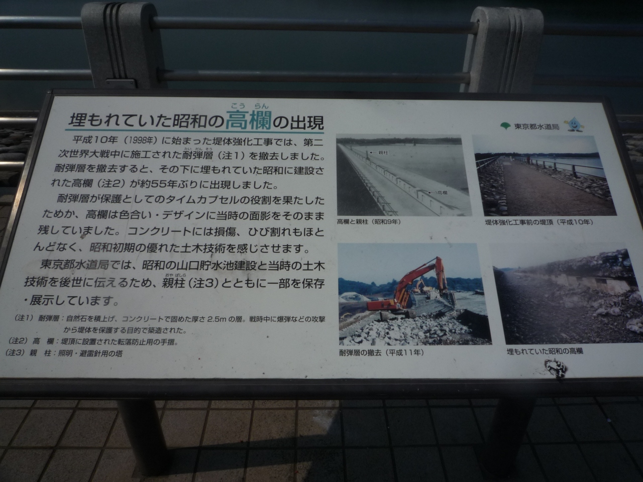 この狭山湖では、平成10年に始まった堤体強化工事で、昭和時代の高欄が出現したとの事です。発掘者は、昭和初期の土木技術の高さを感じたそうです。その様子が写真で表示されてます。ぜひ、一度、見てみてください。