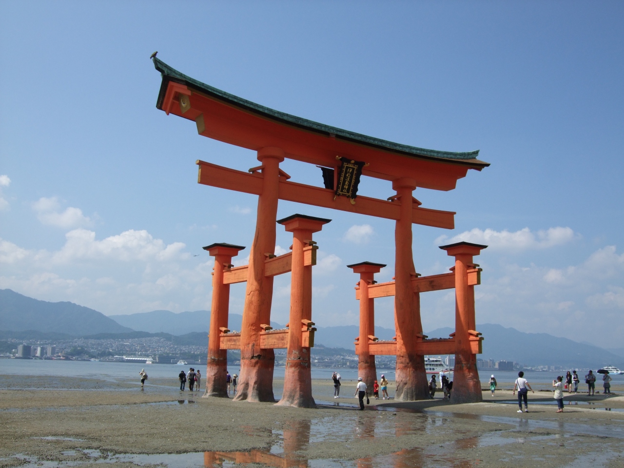 潮が引いて、大鳥居の下には大勢の観光客が集まっていました。近くに行ってみるとこの鳥居は確かに巨大です。柱の根元辺りには節くれだったところもありまして、天然木を使ったこともよくわかります。足元の水溜りには小さな貝や小魚もいて、家族連れにはかっこうの遊び場となっていました。ただし、鳥居の内側は境内なので、潮干狩りをしないように注意書きがありました。