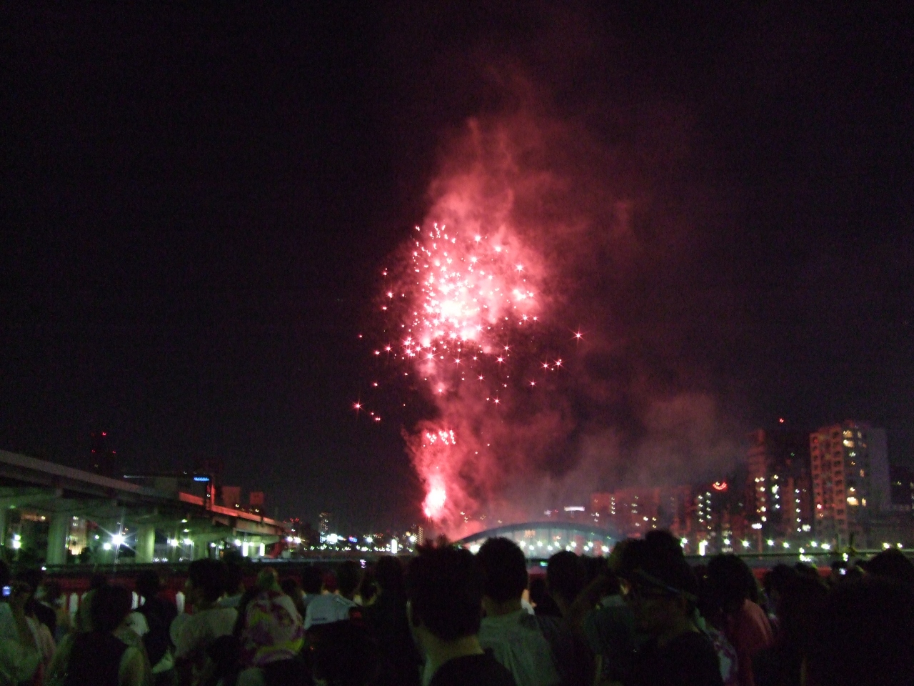 初めて行ったのですが、すごい人ごみ。それに、どこで見たらいいのかはっきりしないので、随分ウロウロ、回り道をしてしまいましたが、結局は雷門から並んで吾妻橋を渡りながら眺めるのが一番いいと思います。歩きながら見ると行っても、連続して打ちあがる間はちゃんと立ち止まって見る余裕があります。第一会場と第二会場の花火が橋の両側で上がるので、両方同時に見れますし、たくさん繰り出した屋形船も遠くに見えて風情があります。そんな贅沢なロケーションはも多分ここだけでしょう。あと、特筆は交通整理のお巡りさん。橋の入り口に設置したやぐらの上から、誘導してくれるのですが、観客のあせる気持ちをユーモアで和らげてくれました。これも隅田川花火大会ならではかもしれませんね。
