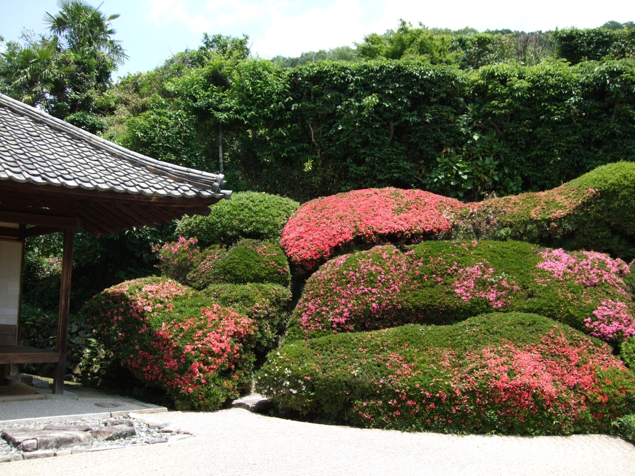 しかし、それにしても、この名勝庭園は遠州流の特徴が遺憾なく発揮されています。正面の大刈り込みはゆったりと波を打ったつつじの刈込みの奥に二段の生垣。軒先の敷石も直線的で大胆な意匠です。写ってはいませんが、鶴島・亀島の石組みも石を立てた力強いもの。コンパクトですが、これで十分な配置です。ちょうど、つつじが見ごろを迎えて一段と美しく、目が覚めるようでした。